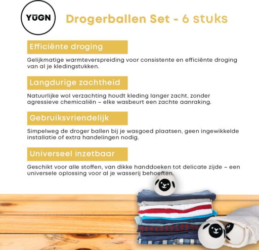 Maak jouw wasroutine duurzamer en efficiënter met de YUGN Drogerballen van 100% wol. Deze natuurlijke droogballen verkorten de droogtijd, verminderen kreukels en zorgen dat kleding heerlijk zacht blijft.