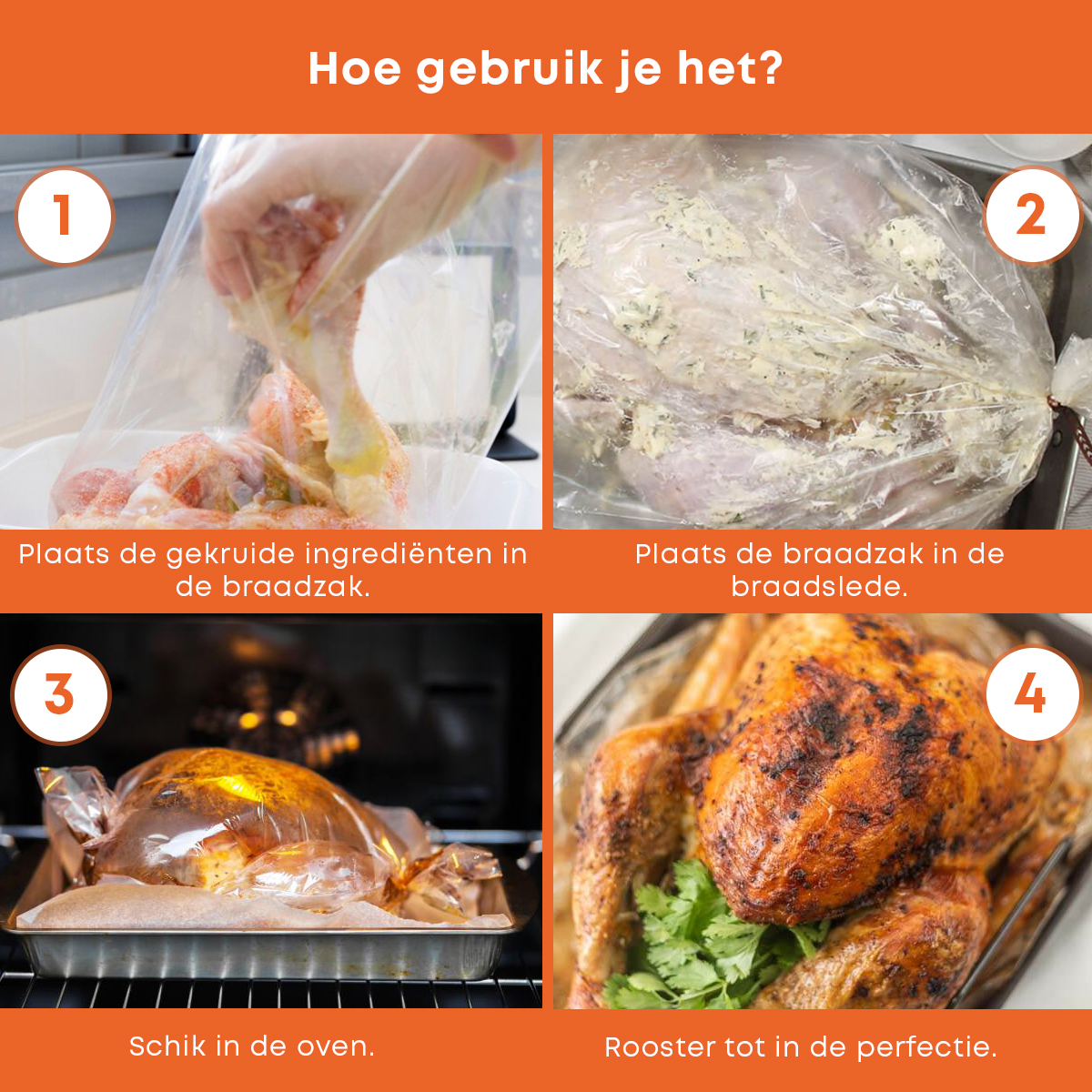 De braadzakken voor in de oven en magnetron zijn zeer eenvoudig te gebruiken. Je hoeft enkel de oven voorverwarmen, het voedsel zonder olie of boter in de braadzak te stoppen en de braadzak te sluiten. Knip een hoekje van de braadzak af zodat de stoom kan ontsnappen en plaats de braadzak met het voedsel in een ovenschaal in de oven.
