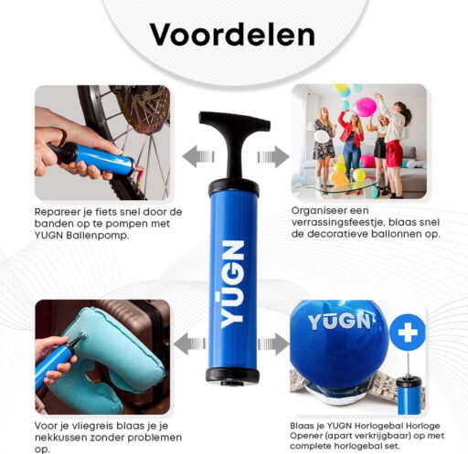 Wil jij ook graag een luchtpomp waarmee je alles kunt opblazen van een kleine horlogebal tot een fietsband. Dan heeft YUGN de ideale lucht pomp voor jou. Met de ballenpomp van YUGN kun je van alles op pompen. De set die je thuis gestuurd krijgt bevat: 1x gloednieuwe luchtpomp, 1x klein ventiel, 1x lang ventiel, 1x stalen naald en 1x verlengstuk.